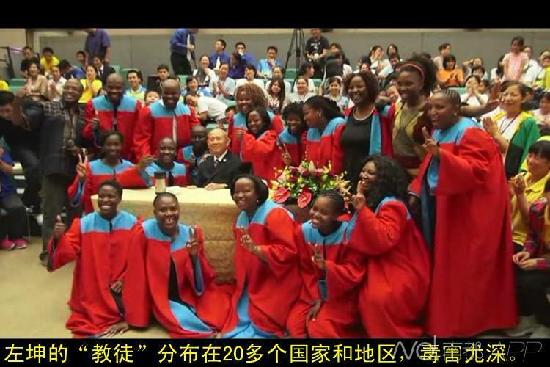 左坤(第二排中间黑衣者)在国外一次教徒集会中。他说,“我的生命是从神来的,是不会死的”;他的姓名几千年前就写在经上了——就像《鹿鼎记》里神龙教的洪教主。