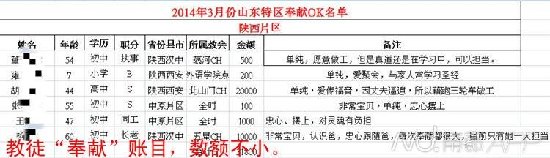 2014年3月陕西片区奉献款名录,有中年教徒、一个三轮车工人一次向左坤奉献了2万元。