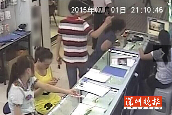 事后,家人对张敏慧的行踪起了疑心。最后,在家人轮番追问下,张敏慧终于将这个秘密公开。在家属提供江某新行踪等线索后,江某新被警方抓获。警方从其手机中找到了张敏慧的裸照,并查到了一次两人开房的视频监控。9月6日下午,深圳市公安局回复深晚记者称,目前,犯罪嫌疑人江某新主要犯罪事实已经查清,已被刑事拘留。目前正等待检察机关提起公诉。图为受害人哥哥店铺的监控视频拍下的画面,身穿红白T恤的江某新正对张敏慧(化名)竖起他威胁时常用的中指手势,要求张下班后找他。 王飞翔摄