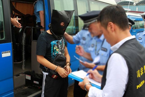 图为犯罪嫌疑人移交现场,男子均带黑色头套。