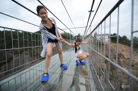 9月24日,一条长约300米、垂直高度达180米的全透明高空玻璃吊桥在湖南平江县石牛寨国家地质公园竣工开通。这是目前为止中国首条高空玻璃吊桥。图为几位游客在吊桥上吓得不敢移动。中新社 杨华峰 摄