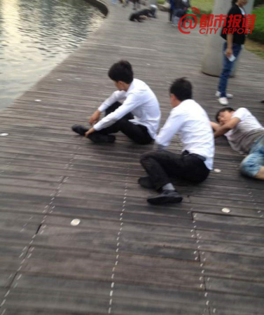 10月2日,河南郑州,郑东新区十几个人在围绕如意湖爬行,几乎每人的衬衣和裤子都磨破了,有人鲜血直流,旁边还有人监督。爬行人称,他们都是某公司员工,由于没有完成销售任务,公司对他们进行体罚。