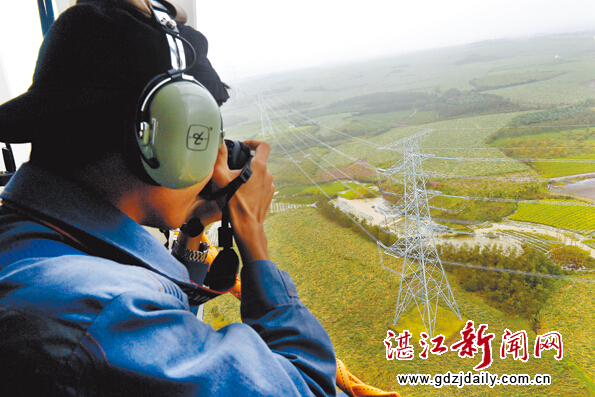 昨日上午,一架蓝白相间的直升机在市区上空久久盘旋,轰鸣声不绝于耳。飞机上坐着一群特殊的“巡线人”,这是南方电网公司首次使用直升机在湛江进行台风后勘灾。