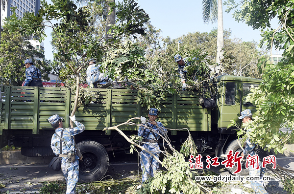 截至7日晚,舰队共出动官兵6400余人次、车辆450余台次,清理、运送各种垃圾近1000车次。仅在东海岛刚点火投产的宝钢湛江钢铁基地,官兵们帮助企业扶植了3万多株倒伏树木。8日早上,2350余名部队官兵、150余辆车再次集结出动,其中,1500余人、100辆大卡车奔赴赤坎区各主次干道、小街小巷,850余人、45辆大卡车穿梭在霞山区大街小巷,继续清运倒伏在市区主干道的断枝落叶、清理堆积成片的垃圾以及扶正路树。虽然汗水湿透衣服,但官兵们全然不顾,埋头苦干,抢抓时间,砍残枝、搬倒树、清扫路面、装运垃圾、扶正栏杆,为湛江恢复灾后各项秩序,恢复城市面貌作出贡献。