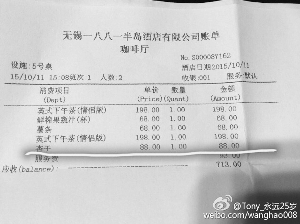 网友“@Tony_永远25岁”在帖子中晒出了酒店账单(见右图),共有6个消费项目,包括两份价值198元的英式下午茶、一份68元的鲜榨果蔬汁、一份68元的薯条、一份88元的杏干,外加93元的服务费,这份下午茶账单的总价为713元。