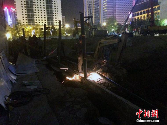 据该小区住户孙先生介绍,“前几天地面上就出现了裂缝,今晚6点半左右准备出去散步的时候发现,裂缝突然变宽了,为防止工地围墙倒塌,一辆挖掘机正顶在即将塌方的围挡墙体处。” 罗云鹏 摄