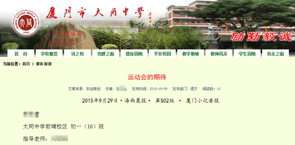 据了解,这是厦门市大同中学的运动会宣传牌,@AkuZwei 表示,运动会将在今天(15日)举办。在大同中学的网站首页上,还有学生写了一篇文章《运动会的期待》。文章中说,今年是大同中学90周年校庆,所以运动会比往年办得隆重。“在运动会临近的那些日子里,大家都在积极地训练。每到放学,操场上可热闹了!有跑步的,跳绳的,跳高的……”