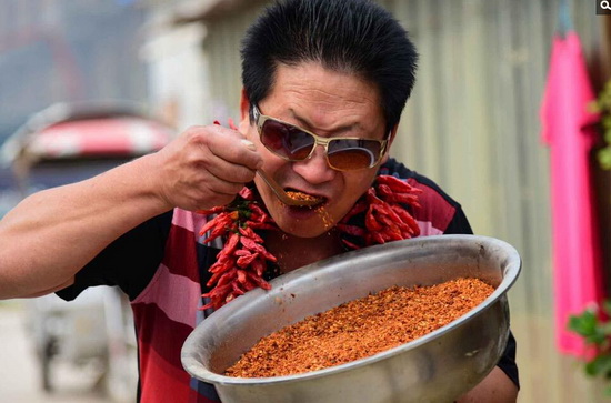 10月18日,郑州一位奇人当众大口大口吃辣椒,该男子嗜“辣”如命,每天能吃5斤辣椒。近日,记者找到了这位“辣椒王”。一见面,他就迫不及待地介绍他的辣椒小天地。在小小的院子里,有来自世界各地的8个品种的辣椒,最引人注目的是一棵五彩椒。