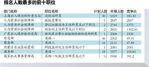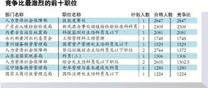 人力资源社会保障部中国就业培训技术指导中心职位最终以2847:1的竞争比摘得2016国考最热职位桂冠;上海出入境边防检查总站边检站科员一职招录30人,最终报名合格人数5559人,摘得过审人数最热桂冠。