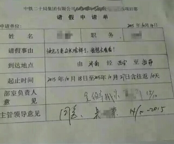 从假条的抬头“中铁20局集团有限公司”来看,这应该是一对长期分在两个项目的一线工地夫妻……