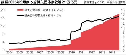根据中金公司研究部统计,机关团体存款占M2的比重,2010年约为5%左右,后来迅速上升,2012年达到13%,2012-2014年则在13%-15%间波动。