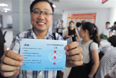 2014年6月17日,河南郑州市金水区行政办事大厅,孙先生领到了单独二孩生育证。图/CFP
