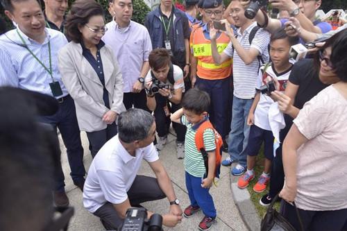 梁振英跟小朋友交谈。