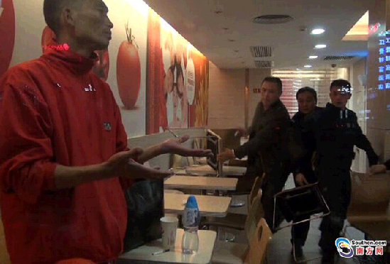 女生冲到韶关电视台女记者身边抱着,内心的恐惧已化作自信和坚强,围观的市民也为这一被挟持的女生的淡定、坚强和机警而感到由衷的佩服。目前,涉案持刀男子已被警方控制,案件正在进一步调查中。图为持刀男子双手一摊。