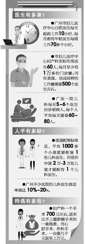 记者了解到,广州市妇儿医疗中心去年门诊量397万人次,出院人数8.1万人次,医生929人、护士1165人。仅在妇产科,普通孕产妇的年分娩量接近2万人,从孕前咨询到分娩,平均每人至少要进行7~10次常规保健、检查,而如果是急诊高危患者,则需要更多精力和人手投入。