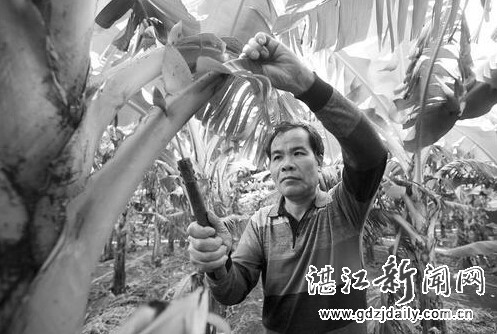 徐闻锦和镇东山村的陈福在田头修剪香蕉。该村因地制宜发展集体经济,村民彻底脱掉了穷帽子。李忠 摄