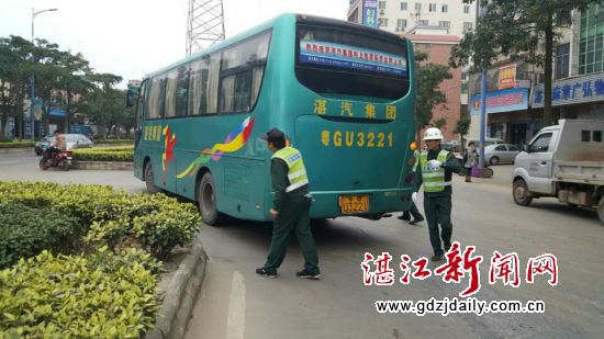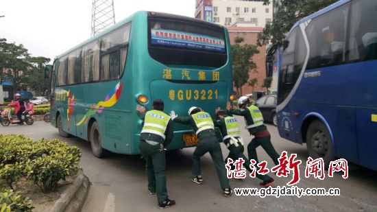 交警麻章大队民警快速反应,为了确保道路畅通,防止交通出现拥挤,按照姜红扬大队长指示,陈伟坚中队长、卓伯勇副中队长迅速带领多名民警和协管员赶往麻章车站,一边安排警力疏导过往车辆,一边安排人员将该车推至影响交通最小的安全地方。由于该车体积大、车身重,即使当时天气寒冷,但帮忙推车的民警和交通协管员们早已汗流浃背,最终及时将车辆成功移至安全地带,快速排除了路面突发交通故障,处于高峰时段的麻章车站一带,没有出现交通堵塞,交通很快恢复了正常运转,受到过往群众的一致好评。