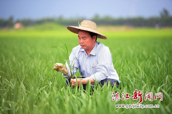 眼下,正是庄稼“强身健体”时节,在雷州市东西洋田硬底化田埂上,总能看到一个中等个头,穿着灰大衣,骑着摩托车匆忙奔波的身影。他时而停下车来,在渠道上来回巡视,时而走进秧田,用随身携带的尺子测量秧苗的生长情况……他就是雷州市农业局农业技术推广中心副主任、高级农艺师李瑞民。