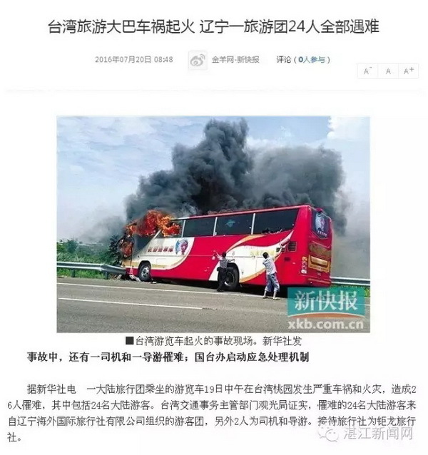 19日,一大陆旅行团乘坐的游览车19日中午在台湾桃园发生严重车祸和火灾,造成26人罹难,其中包括24名大陆游客。