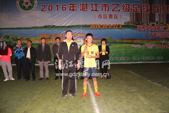 市体育局副调研员、市足协副主席兼秘书长李国华为获得最佳射手叶健颁奖杯