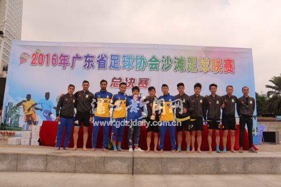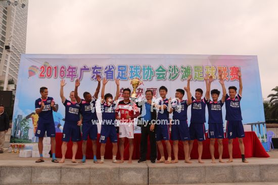 据了解,2016年广东省足球协会沙滩足球联赛于10月至12月在省内采用分站赛会制举行,10月28日-30日在汕尾站,11月25日-27日在惠州站:,12月9日-11日在总决赛设在湛江,每站9-12支队伍,分站赛前四名进入总决赛。 比赛每站分为两个阶段,第一阶段小组赛,分3组进行单循环比赛,每组第一名及总成绩最好的第二名队伍出线;第二阶段淘汰赛,交叉淘汰赛,决出前四名。经过分站PK,惠州市足协中民筑友队,汕尾市好吉祥大酒店足球队、汕尾市仁荣中学足球队、阳江市沙滩足球队、湛江市恒辉足球俱乐部队、湛江市万众炜凌俱乐部队、潮州市恩祈时装腾原竞技足球队等7支球队进入总决赛。经过两天的小组积分赛,A组的惠州市足协中民筑友队,湛江市万众炜凌俱乐部队和B湛江市恒辉足球俱乐部队、潮州市恩祈时装腾原竞技足球队携手进四强赛,在季军争夺战中,湛江市恒辉足球俱乐部队不敌潮州市恩祈时装腾原竞技足球队,止步三甲;在决赛中湛江市万众炜凌俱乐部队对阵惠州市足协中民筑友队,双方实力相当,在即将结束的3分钟,湛江市万众炜凌俱乐部队抓住对手防守空档,打入关键一球,以3:3平局拖入点球大战,但湛江市万众炜凌俱乐部队球员两次点球都被对方守住,惠州市足协中民筑友队以两球全中的优势以5:3完胜,夺得总决赛的冠军。