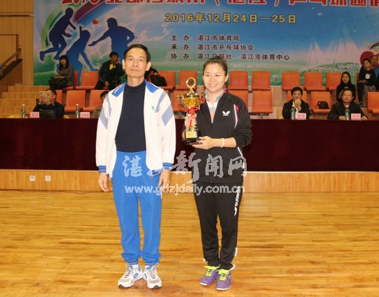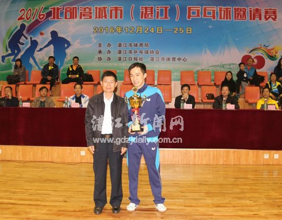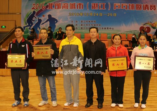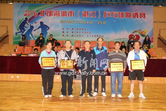 湛江市政协副主席麦马佑、湛江市体育局局长朱陆、湛江市乒乓球协会主席李开荣等相关领导为获奖队颁奖。