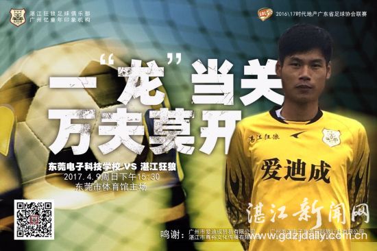 据悉,在上月23日结束了循环赛,东西部赛区的前四名一共8支队伍将加入2016/17时代地产广东省足球协会联赛季后赛进入季后赛,因赛事要求,八进四淘汰赛,先客场后主场的原则。当日东区小组积分第四名的东莞电子科技学校队在东莞市体育馆主场对阵西区积分第一湛江狂狼队,经过紧张激烈的比赛,最终湛江狂狼队凭借实力,客场以4:2战胜东莞电子科技学校队,4月23日15:30湛江狂狼队移师主场湛江市体育中心体育场进行,主场对阵东莞电子科技学校队,力争再下一城,有望提前进入四强。