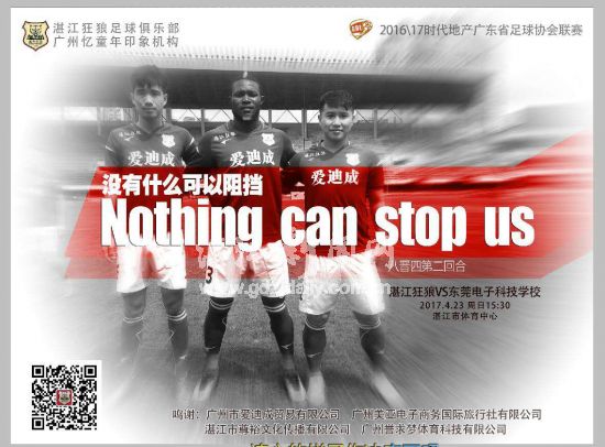 湛江新闻网讯:4月21日,笔者从市足协获悉,4月23日(本周日)下午15:30分,2016~17“时代地产”广东省足球协会联赛季后赛八晋四第二回合回到湛江狂狼队主场湛江对阵东莞电子科技学校队,如湛江狂狼队再下一城,即以两战全胜的战绩战胜东莞电子科技学校队,期待湛江市民前来市体育中心体育场为湛江狂狼队加油鼓劲。