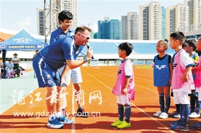 10日,“用切尔西的方式踢球”之湛江青少年足球嘉年华活动在湛江体育中心举行,切尔西俱乐部常驻富力足校青训总监凯文与近百名湛江青少年互动。