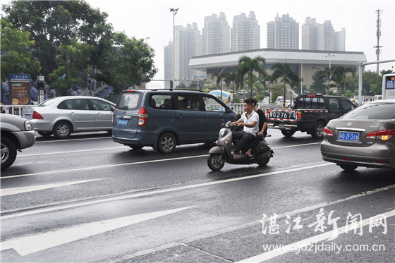 昨日上午九时许,记者在人民大道北与体育北路交汇处,看到两位没有戴头盔的小伙子骑着一辆电动车由南往北逆行穿梭在人民大道北的机动车道上(如图),迫使由北往南正常行驶的车辆纷纷减速,深怕发生意外,旁人看到都捏一把汗。