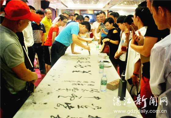 当天,还进行了对书友作品的名家点评以及现场挥毫和交流等活动。记者从现场看到,活动不仅吸引了湛江市区的书法爱好者积极参与,各县(市、区)书友们共150多人也踊跃前来,人头涌涌,热闹非凡。甚至很多家长把自己小孩也带来,从小接受书法文化的教育和熏陶。