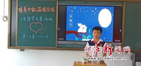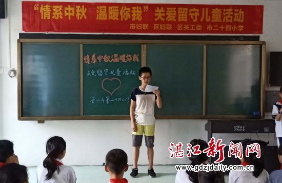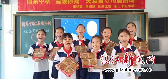 湛江新闻网讯:每逢佳节倍思亲。在中秋佳节来临之际,为让留守儿童过上一个幸福愉快的节日,9月21日,湛江市第二十四小学在儿童快乐家园活动室开展了“情系中秋 温暖你我”关爱留守儿童共庆中秋佳节活动,赤坎区妇联主席吴丹、区关工委常务副主任田欣民及35名留守儿童参加了此次活动。