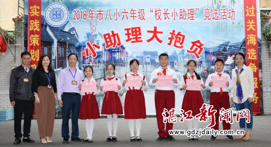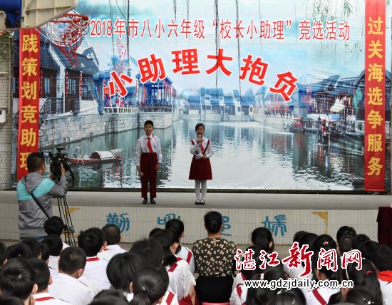 10月12日上午,湛江市第八小学的校园里热闹非凡,2018年“小助理大抱负”校长小助理竞选活动在这里隆重举行。本次活动旨在锻炼少先队员的自理、自立能力,鼓励他们参与学校管理,成为学校的小主人。队员们踊跃参与,300余名学生通过自愿申报、笔试初选、班级推荐等环节,12名同学脱颖而出,参加12日的最终竞选。第一环节是校长小助理竞职演讲。“准校长小助理们”都能够脱稿演讲,而且基本做到仪态自然、条理清晰、语言流畅;他们或陈述个性、特长和优势,或谈当选后的“施政纲要”,均表现出了良好的素质和责任意识。