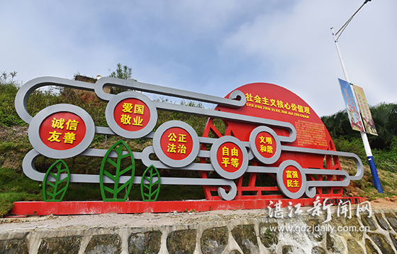 梧阔村村口大道的创文公益广告设计成大海波浪艺术造型,具有滨海特色。