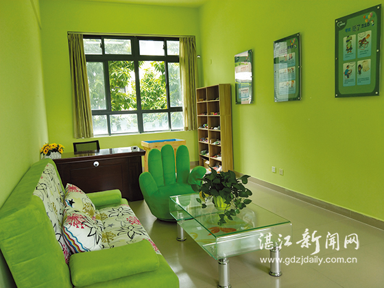 不用怀疑,这确实不是梁怡的“公主房”,而是学校里公共的放松室。这个放松室,是湛江市第二中学“七色光”心理咨询室的一部分。整个“七色光”心理咨询室有两三间教室般宽敞,舒适的躺椅、有趣的沙盘、别致的玩具,装饰画、小书柜等,把团队辅导室、个体辅导室、档案管理室等错落有致地划分,又组合成一间温馨、舒心的“心灵氧吧”。