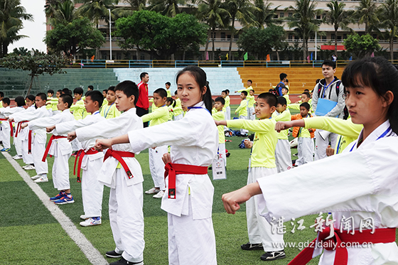 12月8日,湛江市少林学校彩旗招展。2018年全国青少年体育冬夏令营(广东站)·湛江市空手道冬夏令营在湛江市少林学校开营。市体育局、市空手道协会等有关负责人和来自全市各个学校的800多名少年儿童参加开营仪式。