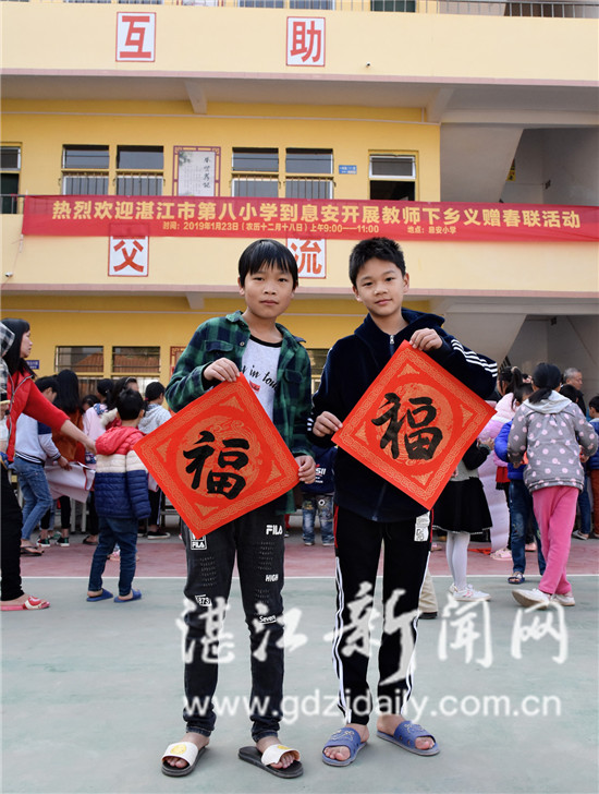 “喜居宝地千年旺,福照家门万事兴”“一帆风顺年年好 万事如意步步高”来自遂溪县文车村的村民,拿着老师们的手写春联,连声说做了一件大好事,手写的春联让人感觉到了浓浓的“中国年味”。1月22—23日,湛江市第八小学联合赤坎区老年大学举行义务送春联下乡活动。参加此次活动的有赤坎区老年大学的七名学员和市八小的二十余位教师。