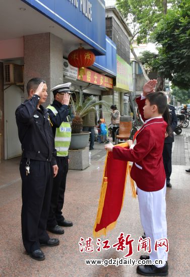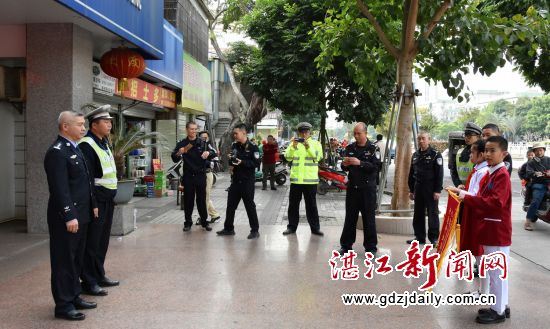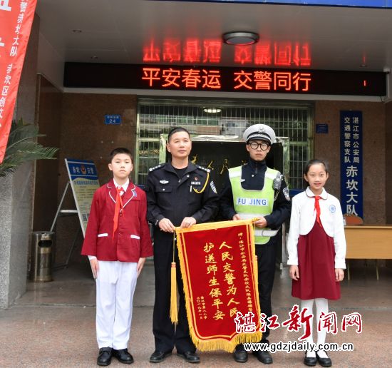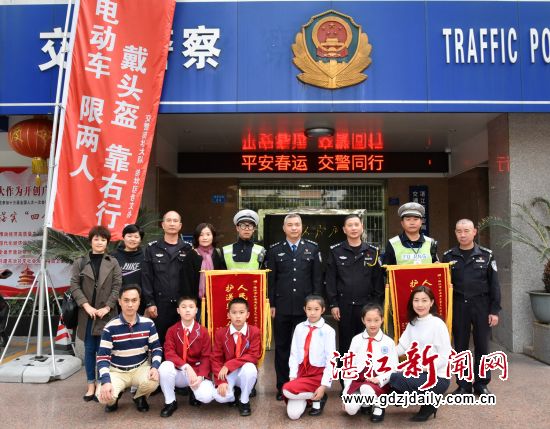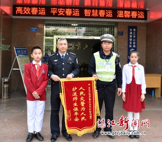 湛江新闻网讯:1月28日,湛江市第八小学谢海燕副校长带领学校家长代表、少先队员代表将写有“人民交警为人民 护送师生保平安”的锦旗分别送到湛江市公安局交警支队赤坎大队林乔艳和陈嘉谦两位辅警手中,感谢他们常年在市八小跃进校区门前设立交通安全护学岗,为学校师生平安出行所做的工作。湛江市公安局交警支队赤坎大队大队长林庚、教导员戴敏、副大队长李志翔、赤坎大队勤务二中队中队长翁松山、副中队长陈贤松等领导出席了赠送锦旗仪式。