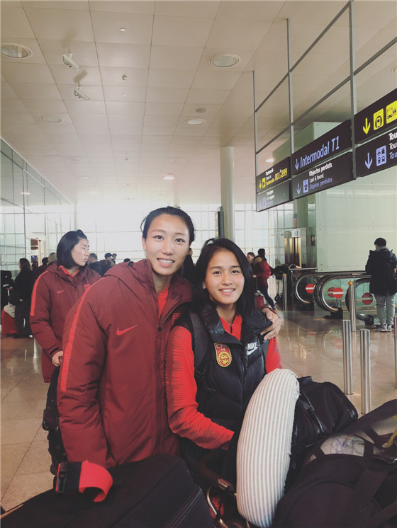 北京时间2月11日下午,坡头姑娘林宇萍(左)、雷州妹陈巧珠随中国女足国家队飞抵西班牙巴塞罗那集训,认真备战6月的女足世界杯。(图片由受访者本人提供)