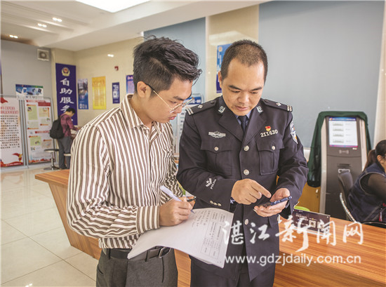 值班民警陈饮忠在给记者讲解手机端预约的流程。