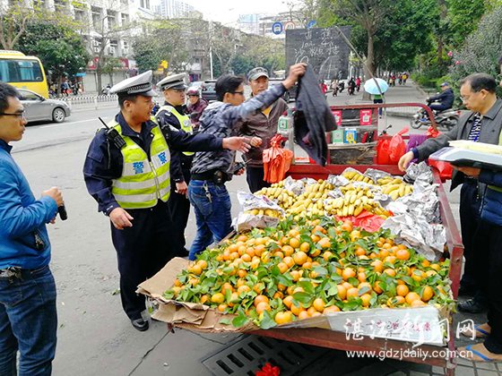 执勤民警整治摆摊占道违法行为,劝导共建文明交通