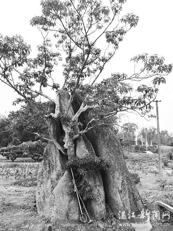 笔者发现,在离网状树屋约三米处,榕树伸出来的气生根内还有一棵早禾果树,气生根生长旺盛,呈网状,紧紧抱住早禾果树身,又与老榕树形成一处靓丽的风景组图。2018年,廉江市林业局专门对这棵古榕树进行仪器探测及科学分析,工程师作出最终鉴定,确认该古榕树龄为130年。