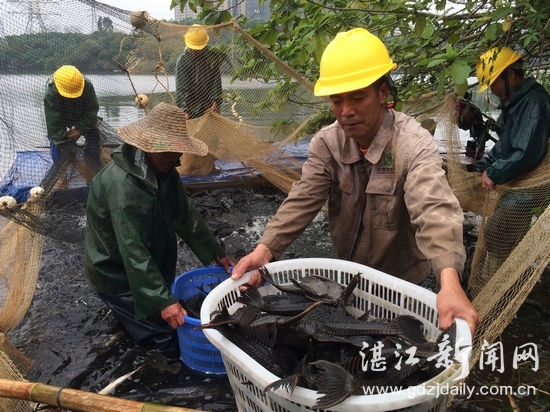 3月9日,捕鱼工在赤坎水库围捕清理“清道夫”。记者 林石湛 摄