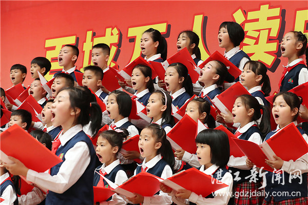 “在东方,有横撇竖捺的方块字;在东方,大写的方块字里,让我们和世界一起,读中国……”17日下午,湛江市图书馆里传来朗朗诵读声,全国“百城万人读中国”大型公益朗诵活动(广东湛江分会场)正在举行,近200名市民齐声诵读《读中国》。