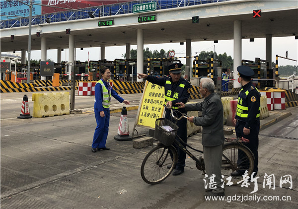 原来当日下午,省高湛江分公司湛徐路政二中队路政人员正巡逻至徐城收费站,发现收费站入口处一名老伯欲骑着自行车进入高速公路,收费站出入口来往车辆不停从老伯身边呼啸而过,老伯处境十分危险。路政人员马上上前将老伯引导至安全区域。