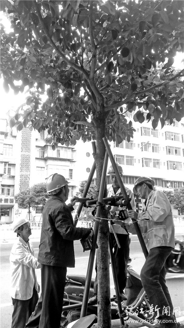 据了解,这些路树移栽过来时带根少、根系浅,为了防止树木在大风中倒伏,园林工人在栽种路树时都会给路树加上架子加以固定。随着路树逐年成长,树径增粗,园林工人每年春末夏初都会给路树“解套”松绑。