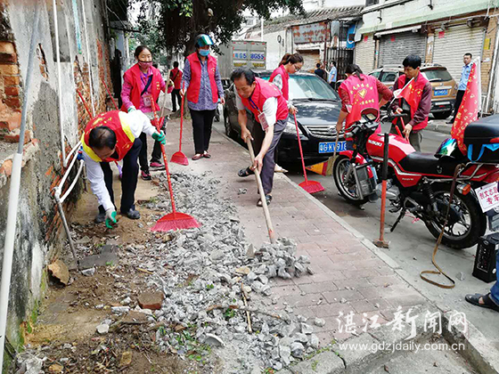3月29日上午,霞山区爱国街道办组织东堤社区干部和尤伯志愿者服务队成员共36人,对东堤社区进行环境卫生整治,清理卫生死角。