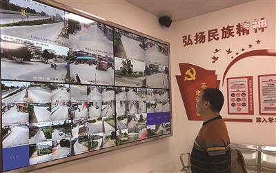 村干部正在唐基村视频监控中心了解村内治安情况。