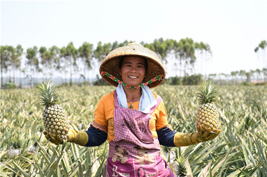 3月28日,职工展示采摘的菠萝,享受丰收的喜悦。