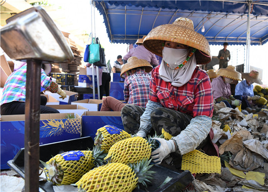 3月28日,广东农垦徐闻红星农场职工在优选菠萝。